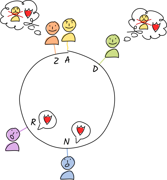 Eventually, everyone knows that Alice is a ‘bad actor’ who has hacked her app. They all ignore her whenever she tries to talk to them, which effectively ejects her from the DHT.